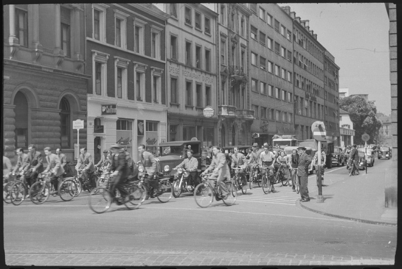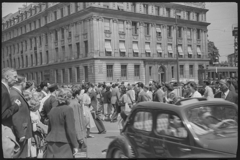 - Fotos der Basler Verkehrsbetriebe dokumentierten das Verkehrsaufkommen an neuralgischen Verkehrsknotenpunkten zu Planungszwecken, etwa am Aeschenplatz zur Mittagszeit.