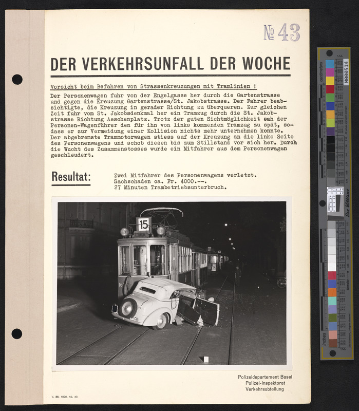 - 1949 publizierte die Basler Polizei erstmals einen «Verkehrsunfall der Woche». An Wachposten, in Schulen und Fahrschulen wurde das Kleinplakat ausgehängt. In knappen Sätzen schilderte es ein oft dramatisches Unfallgeschehen, das sich auf Basels Strassen ereignet hatte. Eine Fotografie zeigte die eindrückliche Szene, und als «Resultat» wurden die Schäden an Personen und Sachen aufgeführt. Immer gab es eine Moral der Geschichte: Von mangelnder Aufmerksamkeit, riskantem Fahrstil oder Alkohol am Steuer wurde abgeraten. Hintergrund war eine steigende Zahl von Unfallverletzten und Unfalltoten nach 1945. Im traurigen Rekordjahr 1962 wurden über 1500 Menschen auf Basler Strassen verletzt und über 30 Personen bei Verkehrsunfällen getötet.