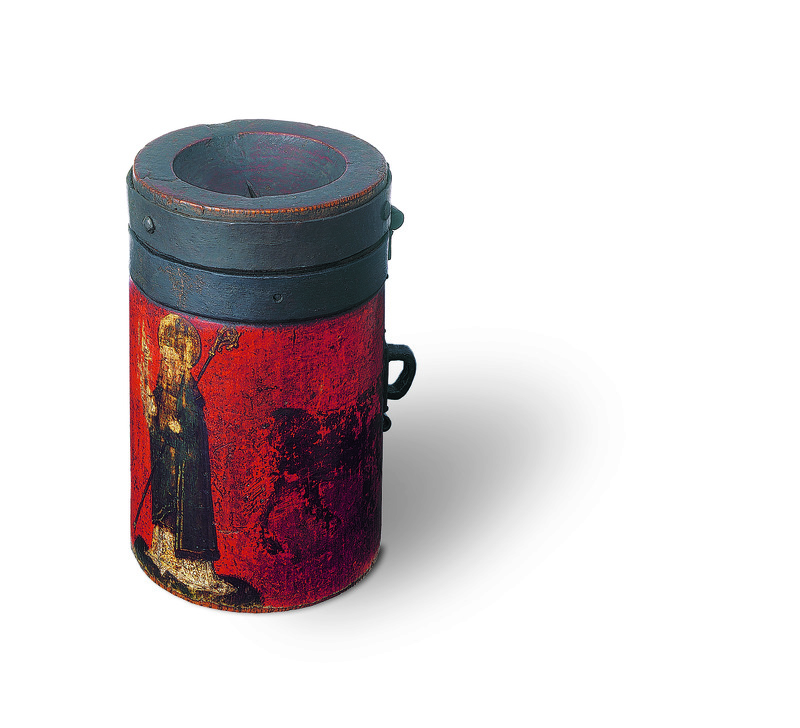 - Die Büchse aus dem frühen 16. Jahrhundert mit dem Bildnis des heiligen Eligius, des Patrons der Hufschmiede, diente wahrscheinlich zum Einziehen von Beiträgen an die Bruderschaft. Ein Einsatz aus rezykliertem Kettenhemd verhinderte die unbefugte Geldentnahme.