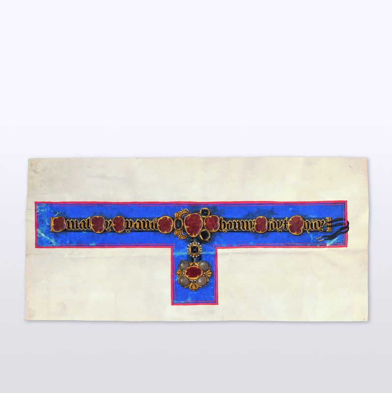 - Das Aquarell wurde zu Verkaufs- und Werbezwecken in Originalgröße angefertigt. 1505 verkaufte der Basler Rat den Hosenbandorden und andere persönliche Schmuckstücke für 40.200 Gulden an den Augsburger Kaufmann Jakob Fugger den Reichen und seine Brüder – über Mittelsleute, um die Miteidgenossen nicht zu verärgern.