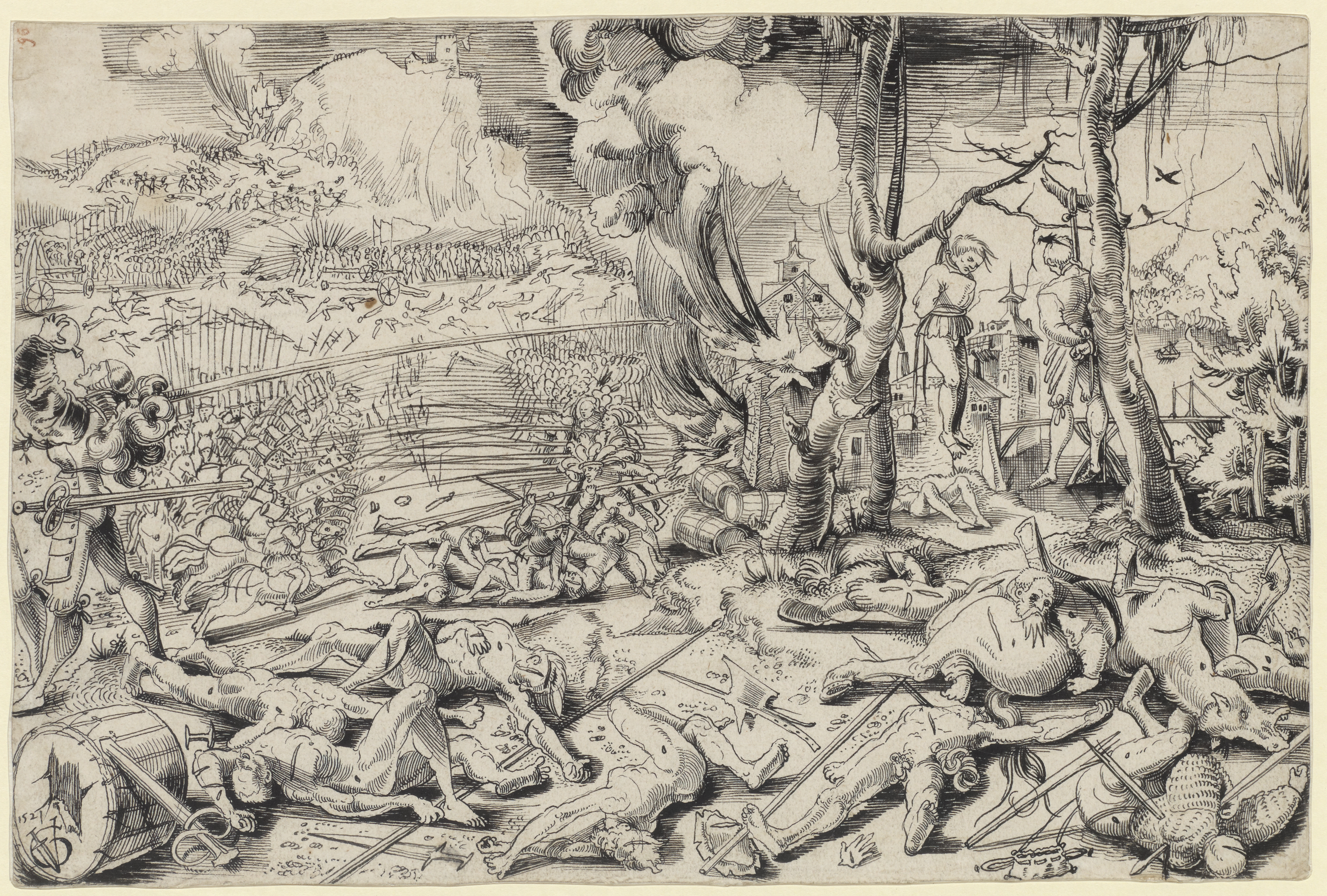 - Der Solothurner Goldschmied Urs Graf ließ sich 1509 in Basel nieder. Dank Ämtern und dem Einkommen aus dem Solddienst erlangte er Wohlstand, kam zugleich jedoch wegen seines Hangs zur Gewalt immer wieder mit dem Gesetz in Konflikt. Eine ähnliche Gegensätzlichkeit findet sich in seinen Federzeichnungen in der Darstellung von Söldnern und den Mailänder Kriegen, an denen er zwischen 1510 und 1521 teilnahm. Dem stolzen Imponiergehabe der Söldnerporträts stehen die Schrecken des Krieges gegenüber; besonders sticht die Federzeichnung ‹Schlachtfeld› heraus, die vermutlich das Gemetzel der Schlacht von Marignano 1515 darstellt.