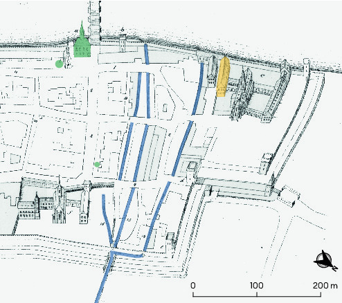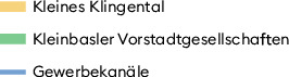 - Gelb markiert ist mit dem "Kleinen Klingental" der erste Wohnbau für die Klingentaler Frauen. Blau eingefärbt sind die Kleinbasler Gewerbekanäle, die mit Wasserkraft Mühlen und Schleifen, Schmieden und Sägen antrieben. Grün sind die Häuser der Kleinbasler Vorstadtgesellschaften im 15. Jahrhundert markiert. Am unteren Rand befindet sich das Areal des Klosters St. Clara.