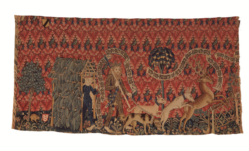 - Entrücktes Spiegelbild aristokratischer Kultur: Der Wirkteppich zeigt wilde Leute – menschenähnliche, aber gänzlich behaarte und meist im Wald lebende Phantasiewesen – auf der Hirschjagd. Dabei war diese gänzlich aristokratische Praxis einfachen Leuten verboten. Doch die vorgeblich Wilden sind zahm (Rapp; Stucky-Schürer 1990), vom sorgsam errichteten Haus über die Jagdwaffe bis zum verzierten Hundehalsband prägt gehobene Kultur das Bild. Dass die Frau ihren Mann auf die Jagd nach etwas Wildem schickt, ist zugleich eine erotische Konnotation. Der Teppich wurde um 1470 aus Anlass der Hochzeit des Basler Bürgermeisters Hans von Flachslanden mit Barbara von Breitenlandenberg angefertigt, wie beigegebene Wappen außerhalb des hier gezeigten Ausschnitts verdeutlichen (Schubring 1995, S. 80–83).