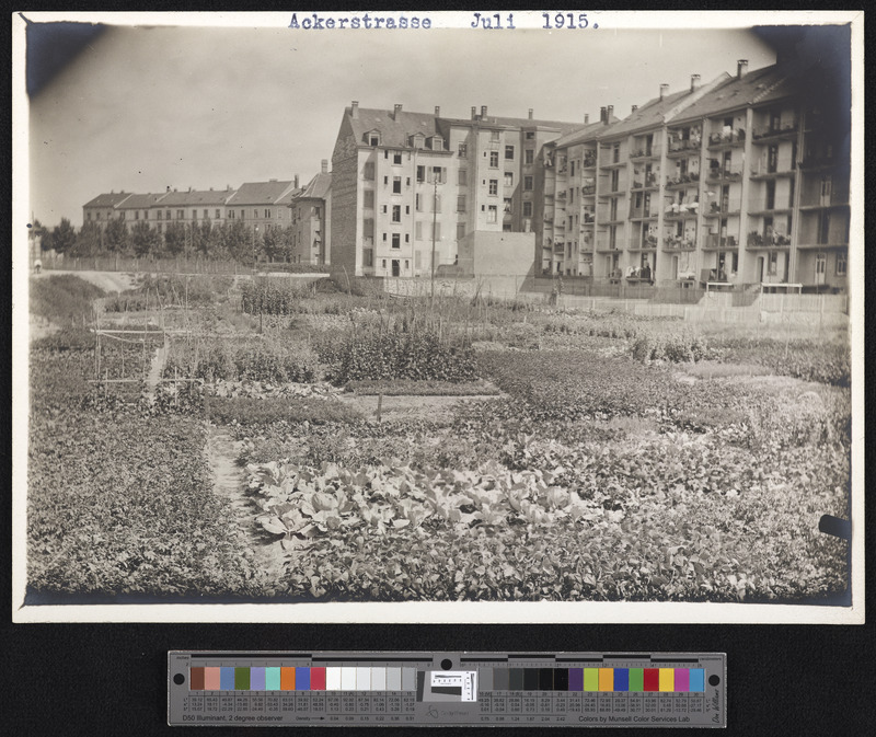 - Der unbekannte Fotograf dokumentierte die dem Nahrungsmittelmangel geschuldeten städtischen Gemüsebepflanzungen während des Ersten Weltkriegs. Sein Bild erlaubt einen seltenen Blick auf die Hoffassade einer noch nicht vollständigen Blockrandbebauung im Klybeck. Die grosszügigen grünen Freiflächen wichen ab 1900 zunehmend grösseren Gewerbebetrieben.