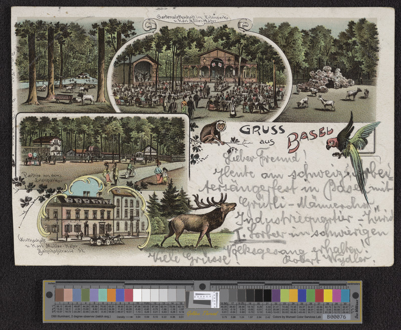- Stadt.Geschichte.Basel: Postkarte mit den verschiedenen Attraktionen des Erlenparks, 1904. Forschungsdatenplattform Stadt.Geschichte.Basel, <https://forschung.stadtgeschichtebasel.ch/items/abb90322.html>, Stand: 07.10.2025.