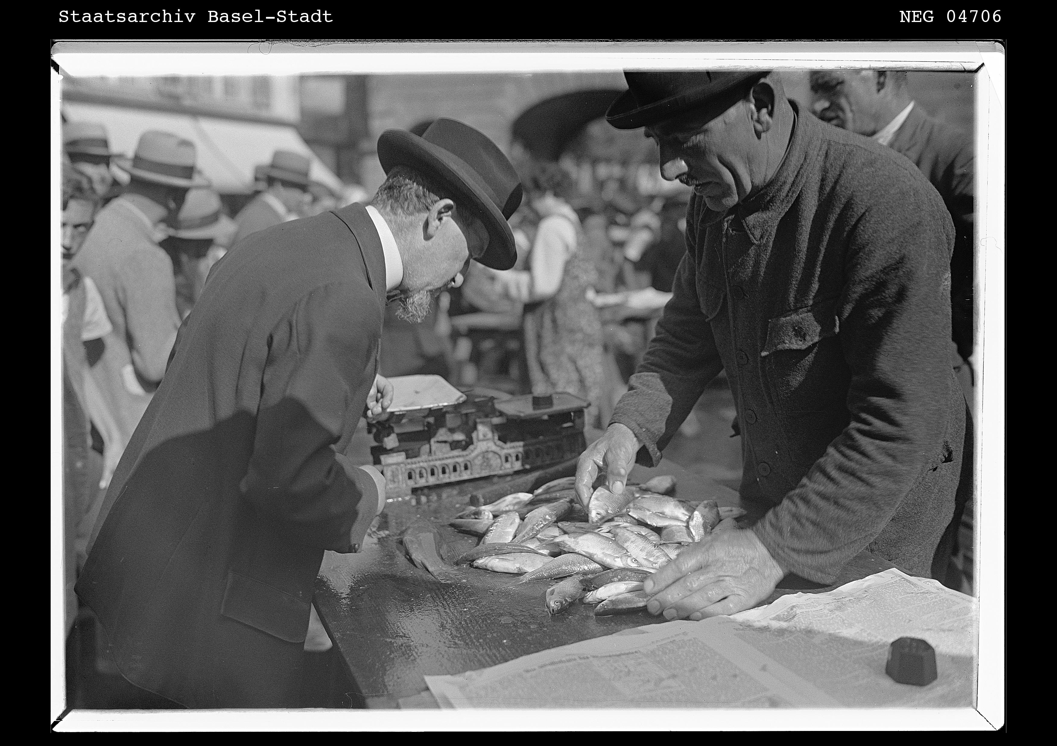 - Stadt.Geschichte.Basel: Auf dem Fischmarkt, 1935. Forschungsdatenplattform Stadt.Geschichte.Basel, <https://forschung.stadtgeschichtebasel.ch/items/abb93170.html>, Stand: 01.01.2026.