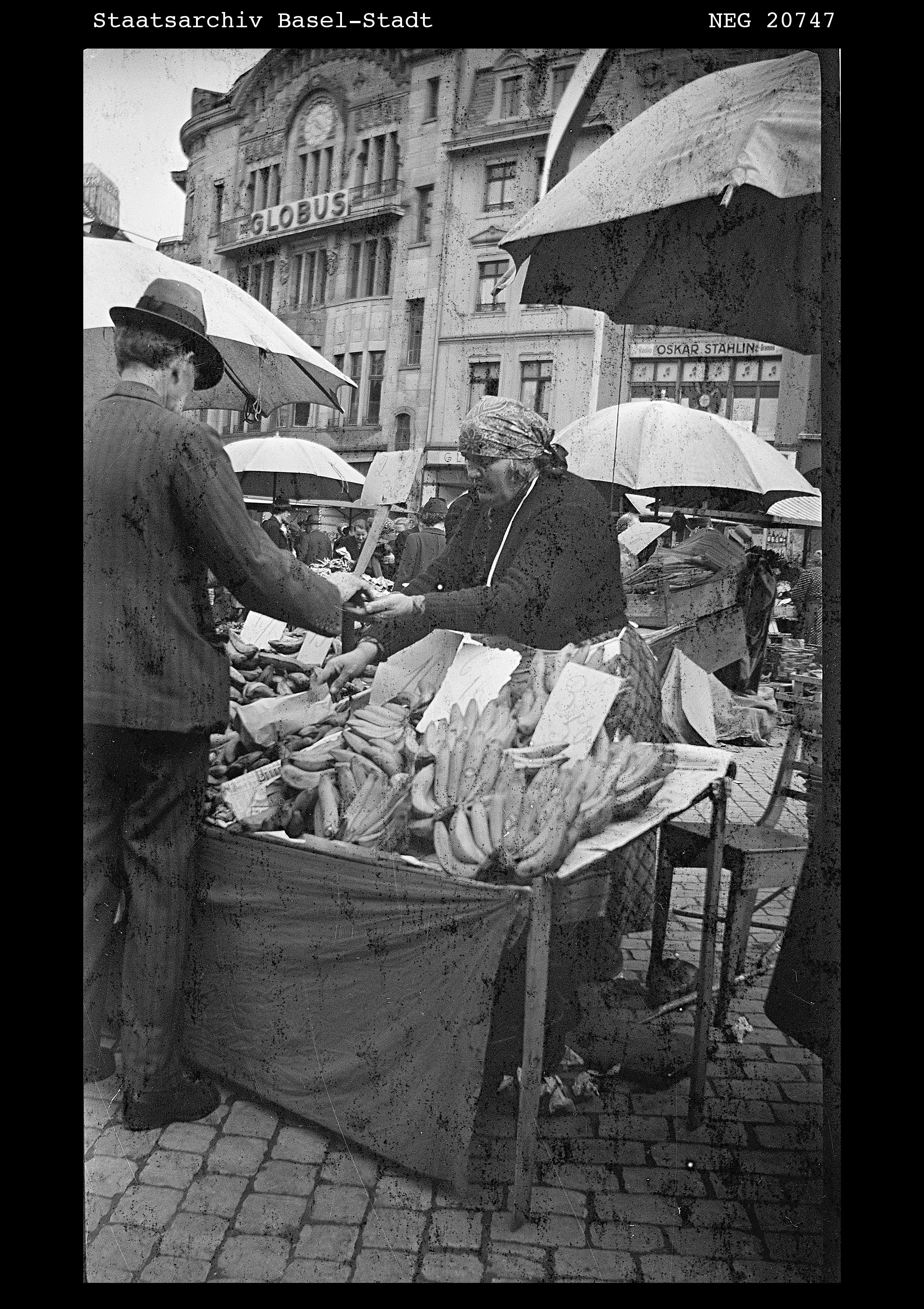 - Stadt.Geschichte.Basel: Auf dem Marktplatz, 1939. Forschungsdatenplattform Stadt.Geschichte.Basel, <https://forschung.stadtgeschichtebasel.ch/items/abb93240.html>, Stand: 01.01.2026.