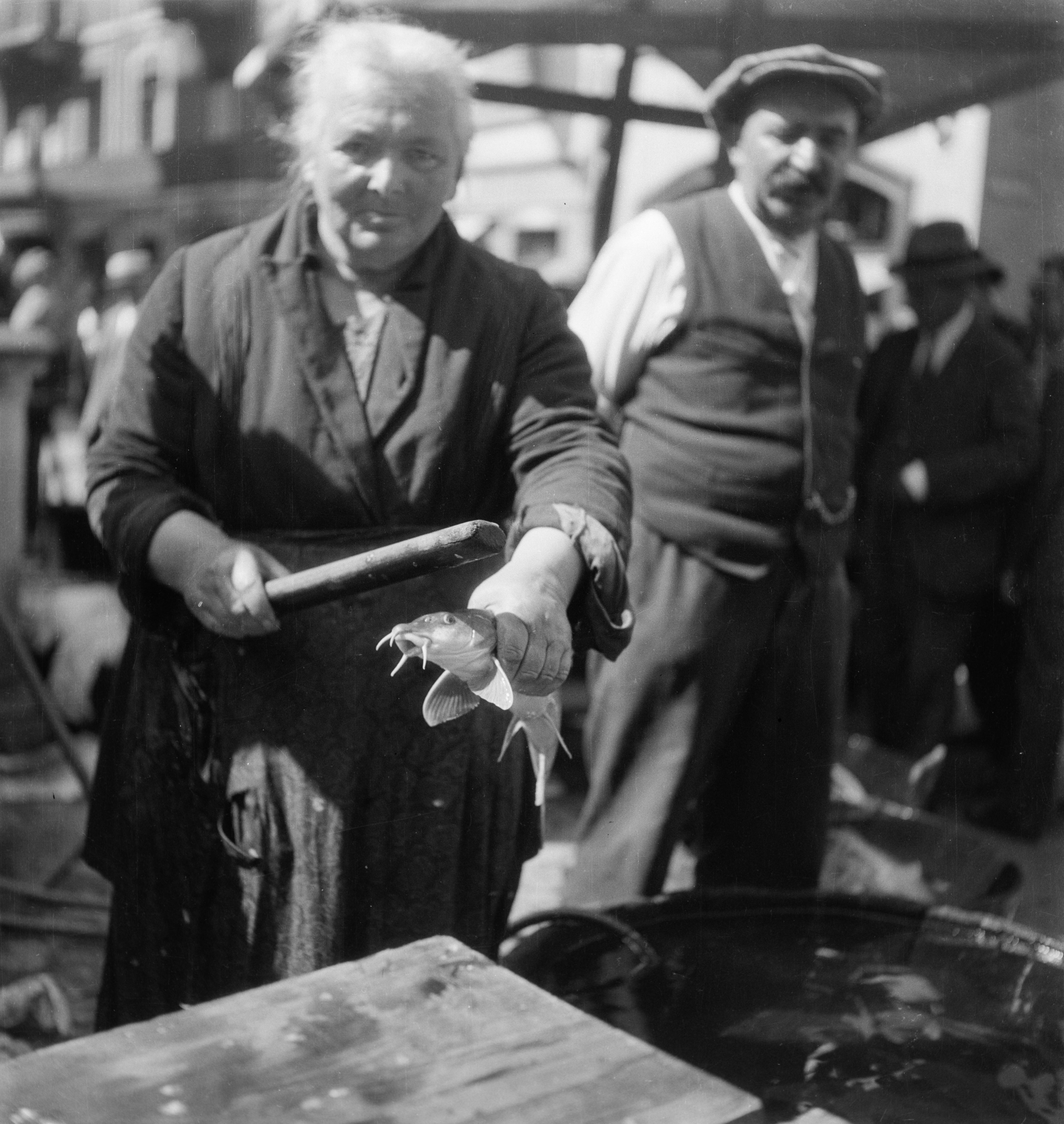 - Fischmarkt: Fischverkäuferin mit Barbe und Totschläger in der Hand.
